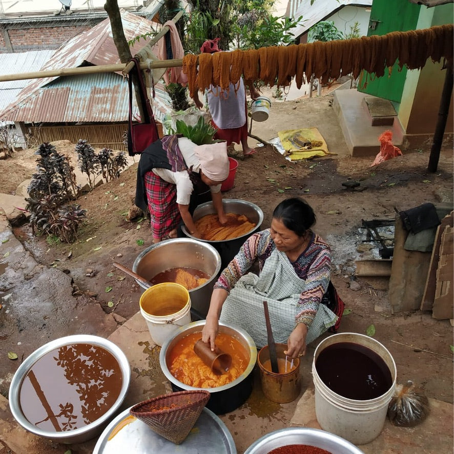 From soaking shawls in iron baths to simmering turmeric over an open flame — the coloring process is sensory and slow.