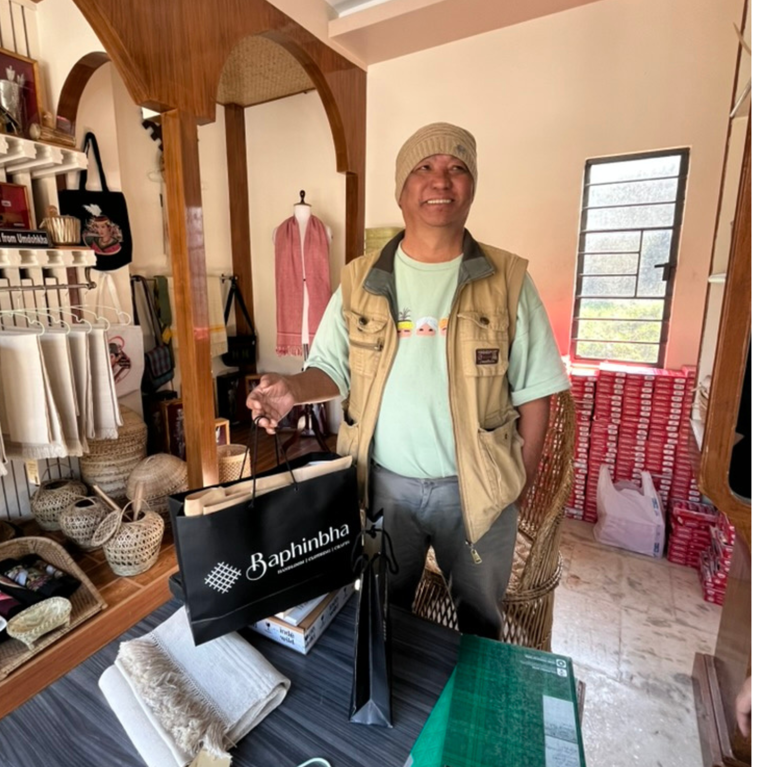 Through this initiative, more than 750 rural households across 14 villages have been engaged in sustainable livelihoods, including farming, spinning, dyeing, and weaving. The silk is produced entirely by hand using traditional techniques and plant-based dyes