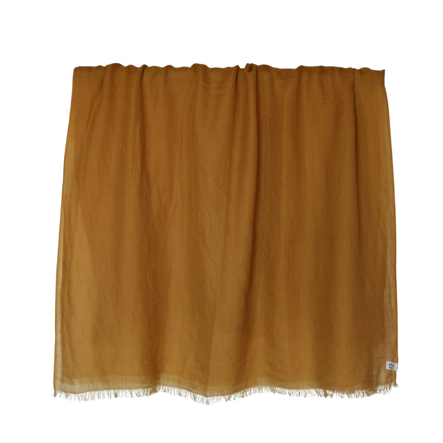 The fibres are among the softest in the world — just 17.5 microns or less — so fine that only four shawls can be woven in a day. Dyed with pomegranate fruit rinds, the yellow tone is gentle and warm — a mustard yellow with a soft, sunlit glow.